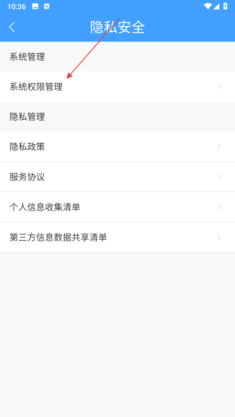 3、在隱私安全設(shè)置界面里,點擊系統(tǒng)權(quán)限管理選項,進入系統(tǒng)權(quán)限管理頁面。