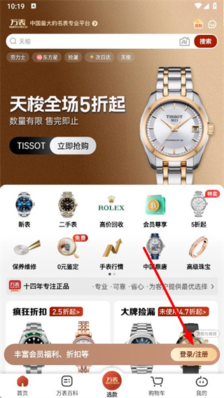 1、在萬表名表珠寶首頁點擊登錄注冊,進入登錄頁面。