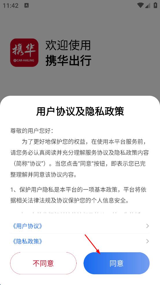 1、打開攜華出行,在彈出的用戶協(xié)議及隱私政策頁面,點擊同意,進入攜華出行主頁面。