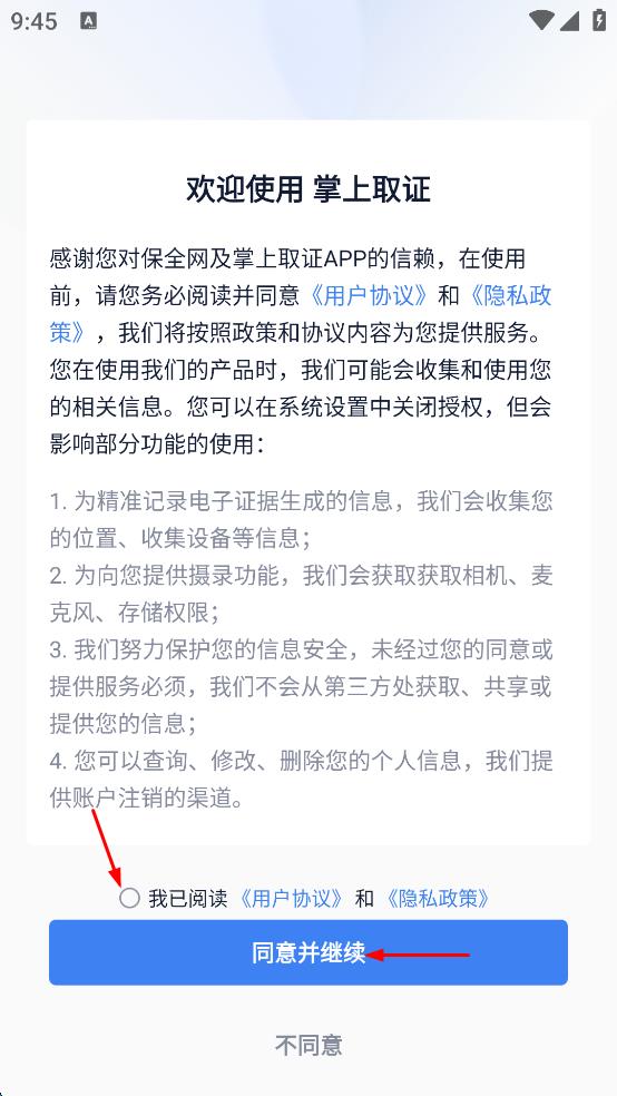 1、打開掌上取證App,閱讀用戶協(xié)議和隱私政策后,勾選我已閱讀,點(diǎn)擊同意并繼續(xù)按鈕。