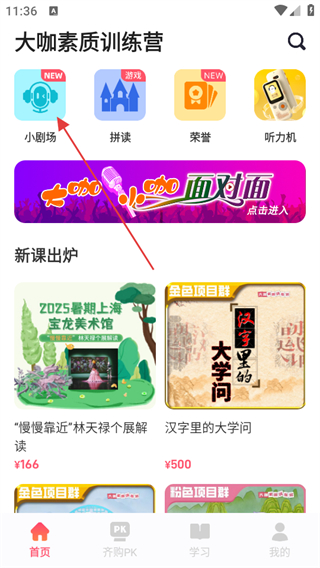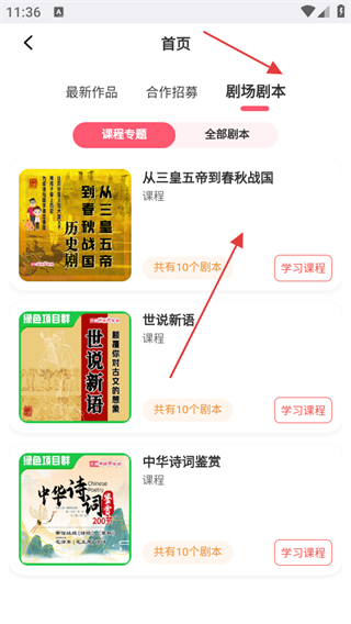 2、進入小劇場頁面后,點擊劇場劇本選項卡,選擇想要錄音的課程。