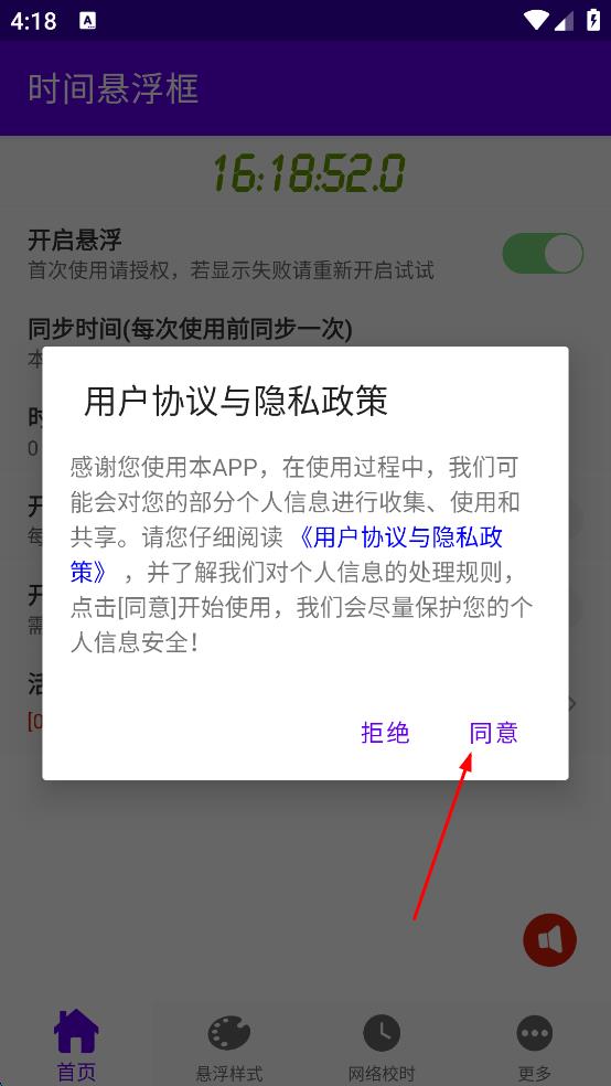 1、打開時(shí)間懸浮框APP,彈出用戶協(xié)議與隱私政策提示框,仔細(xì)閱讀相關(guān)內(nèi)容后,點(diǎn)擊“同意”按鈕,進(jìn)入APP首頁。