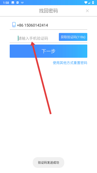 3、在點(diǎn)擊發(fā)送驗(yàn)證碼按鈕,等待后填寫(xiě)驗(yàn)證碼,即可進(jìn)入到下一步驟。