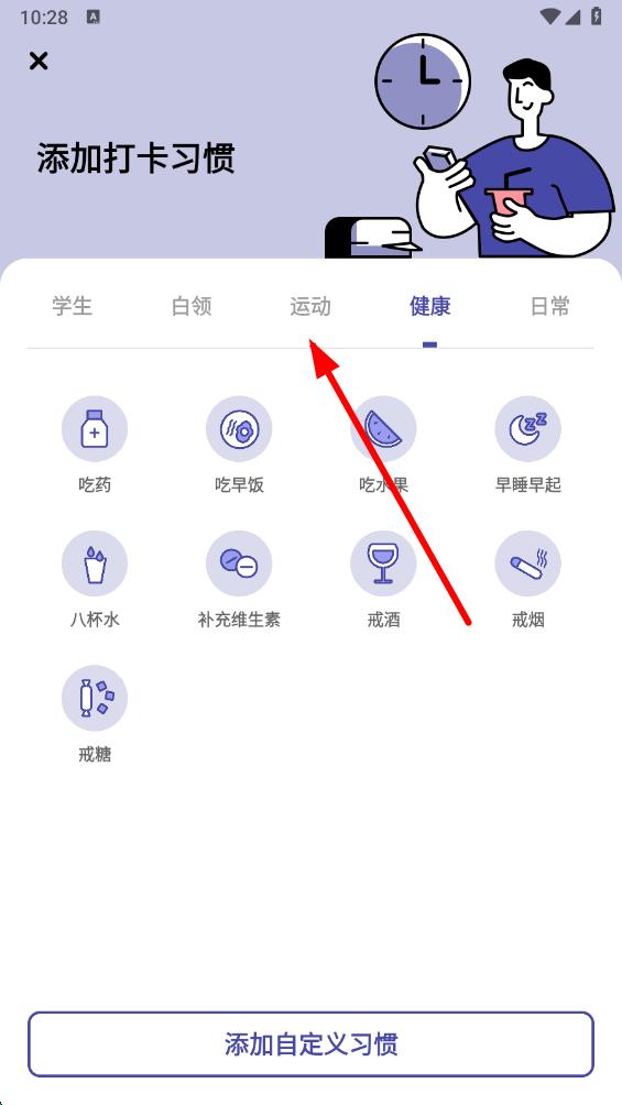 3、在添加打卡習(xí)慣頁(yè)面,點(diǎn)擊上方的運(yùn)動(dòng)分類標(biāo)簽,切換到運(yùn)動(dòng)類打卡選項(xiàng)。
