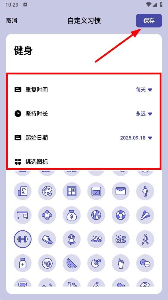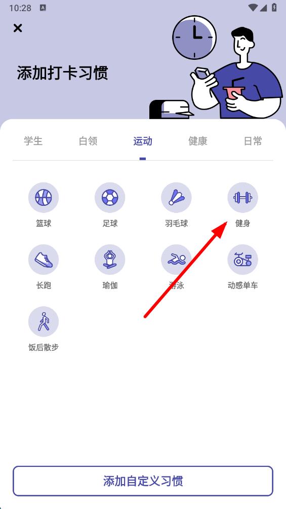 4、在運(yùn)動(dòng)類打卡選項(xiàng)里,點(diǎn)擊健身圖標(biāo),進(jìn)入自定義習(xí)慣設(shè)置頁(yè)面。