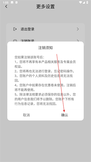 4、點擊注銷須知窗口里的確認按鈕,完成賬號注銷。