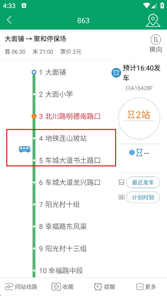 3、在公交的線路詳情頁(yè)面,可查看首末班車時(shí)間、票價(jià),以及從當(dāng)前站點(diǎn)往后的站點(diǎn),如地鐵連山坡站、車城大道書土路口等。