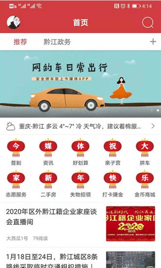 今媒體是黔江本地具有影響力的城市服務(wù)平臺,為55萬多的黔江人提供一站式生活服務(wù),生活信息、消費(fèi)指導(dǎo)、電子商務(wù)、房產(chǎn)、美食、旅游、親子、拼車......盡在今媒體