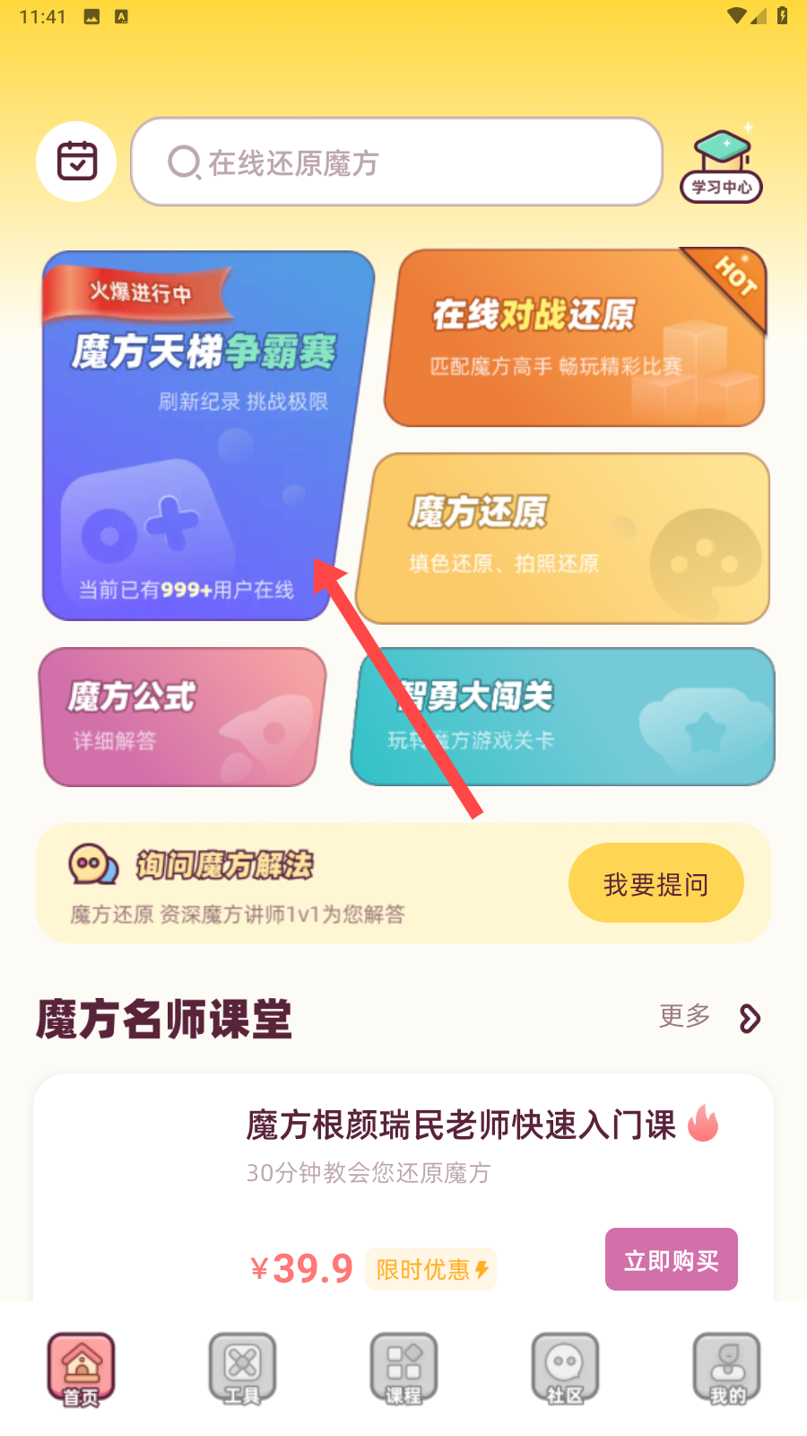 1、首頁功能有魔方天梯爭霸賽、在線對戰(zhàn)還原、等玩法,點魔方天梯爭霸賽,參與賽事挑戰(zhàn),和999+用戶在線比拼。