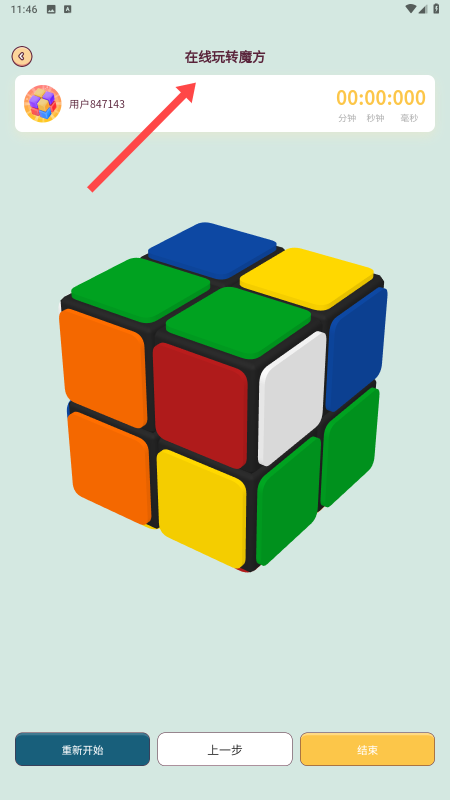 3、顯示在線玩轉(zhuǎn)魔方,呈現(xiàn)用戶、計及魔方模型、操作按鈕有重新開始、上一步、結(jié)束,用于實時還原魔方并計時。