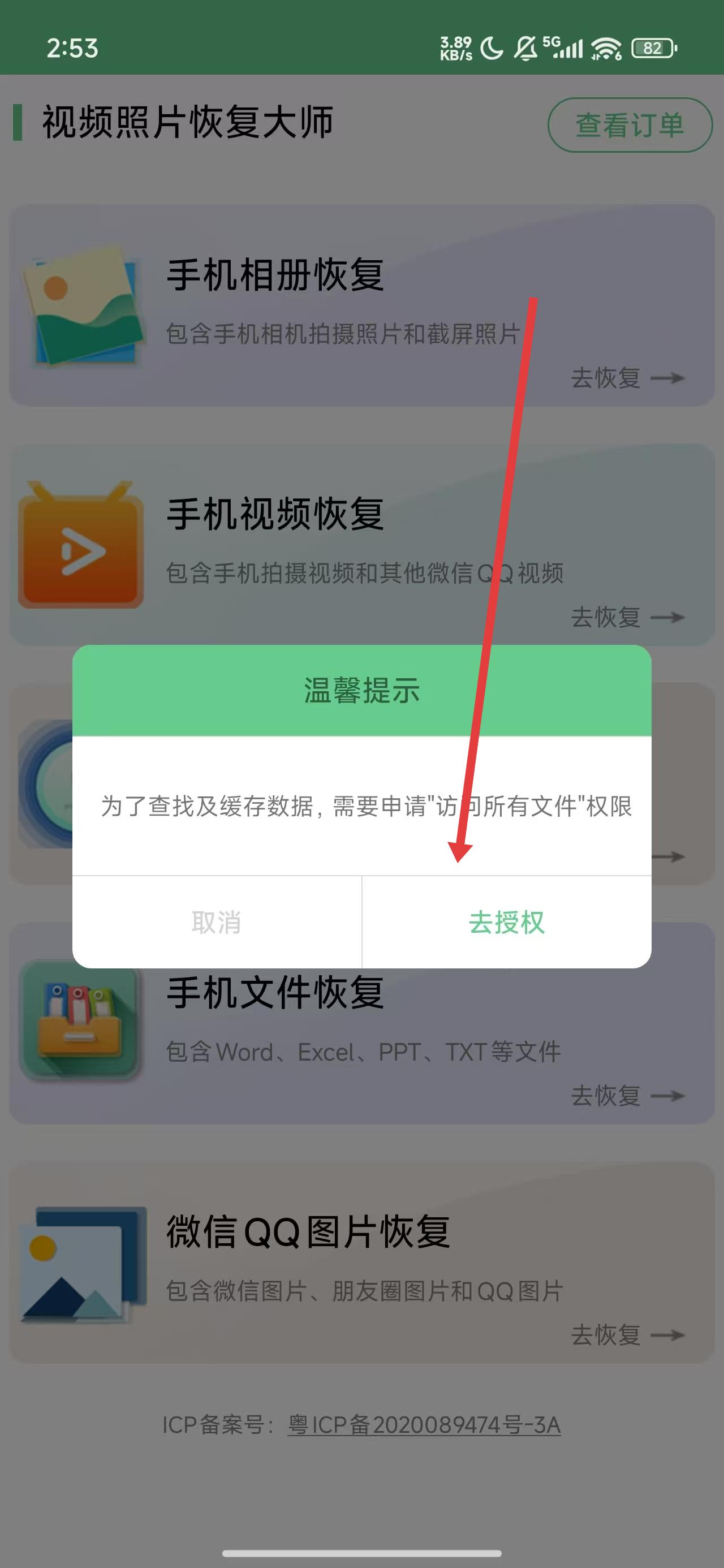 2、在出現(xiàn)的彈窗中,點擊去授權(quán)按鈕,授權(quán)后即可開始進行恢復(fù)操作。