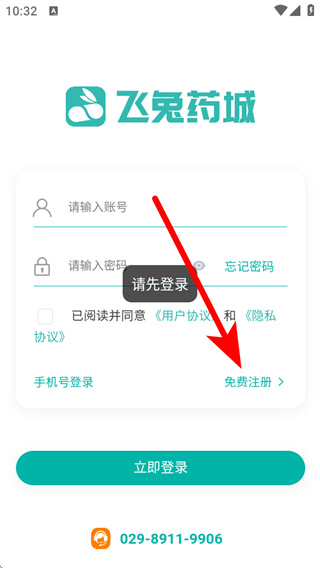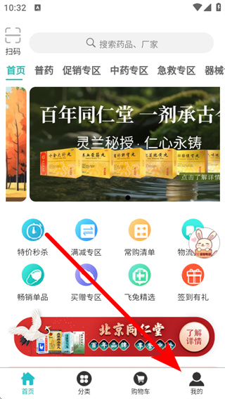 1、打開飛兔藥城APP,點(diǎn)擊右下角我的,進(jìn)入登錄注冊(cè)頁(yè)面。