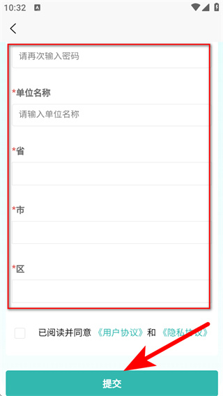4、填寫密碼、單位名稱、地區(qū)等信息后點(diǎn)擊提交,完成賬號(hào)注冊(cè)。