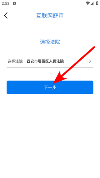 1、在互聯(lián)網(wǎng)庭審的頁(yè)面,我們需要選擇目標(biāo)法院后點(diǎn)擊下一步。