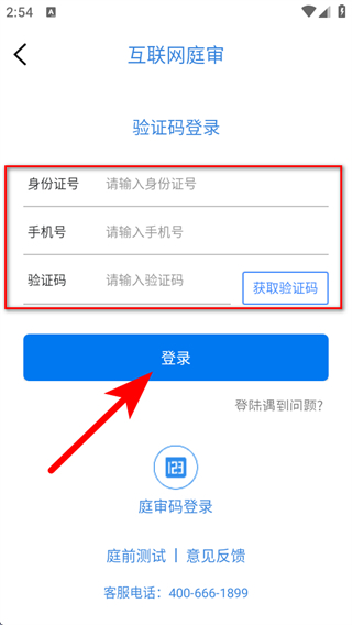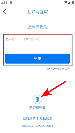 2、進(jìn)入登錄的頁(yè)面后,可以選擇輸入庭審碼的方法或者驗(yàn)證碼登入。