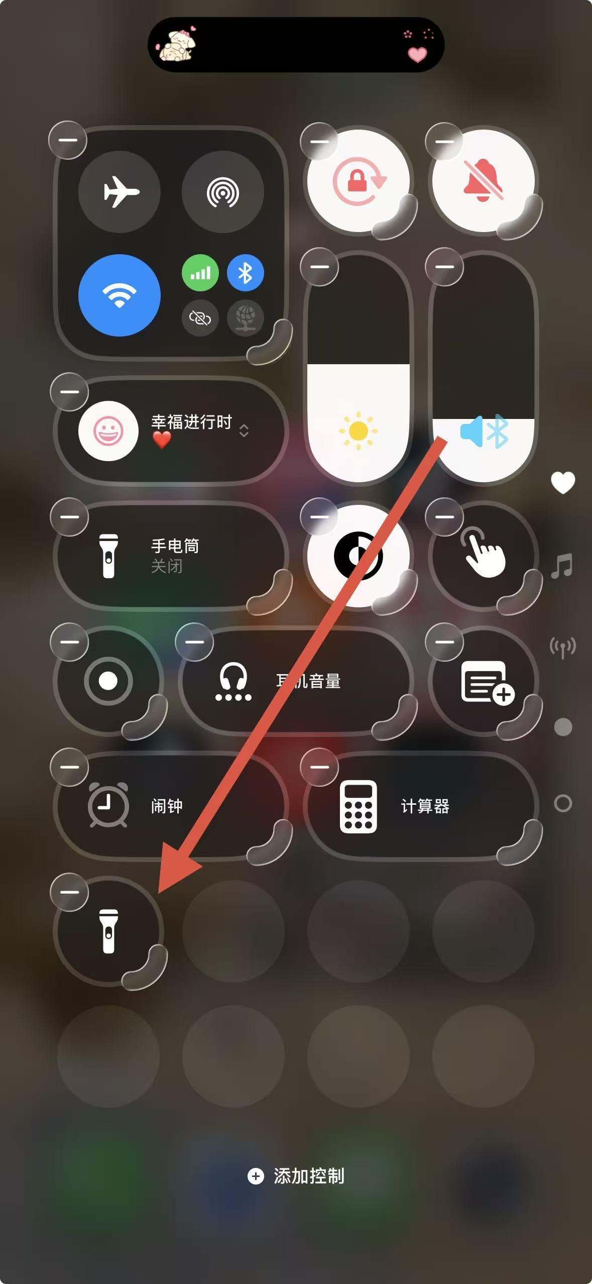 3、點擊手電筒選項對應的添加按鈕,返回控制中心,即可看到手電筒已添加成功。