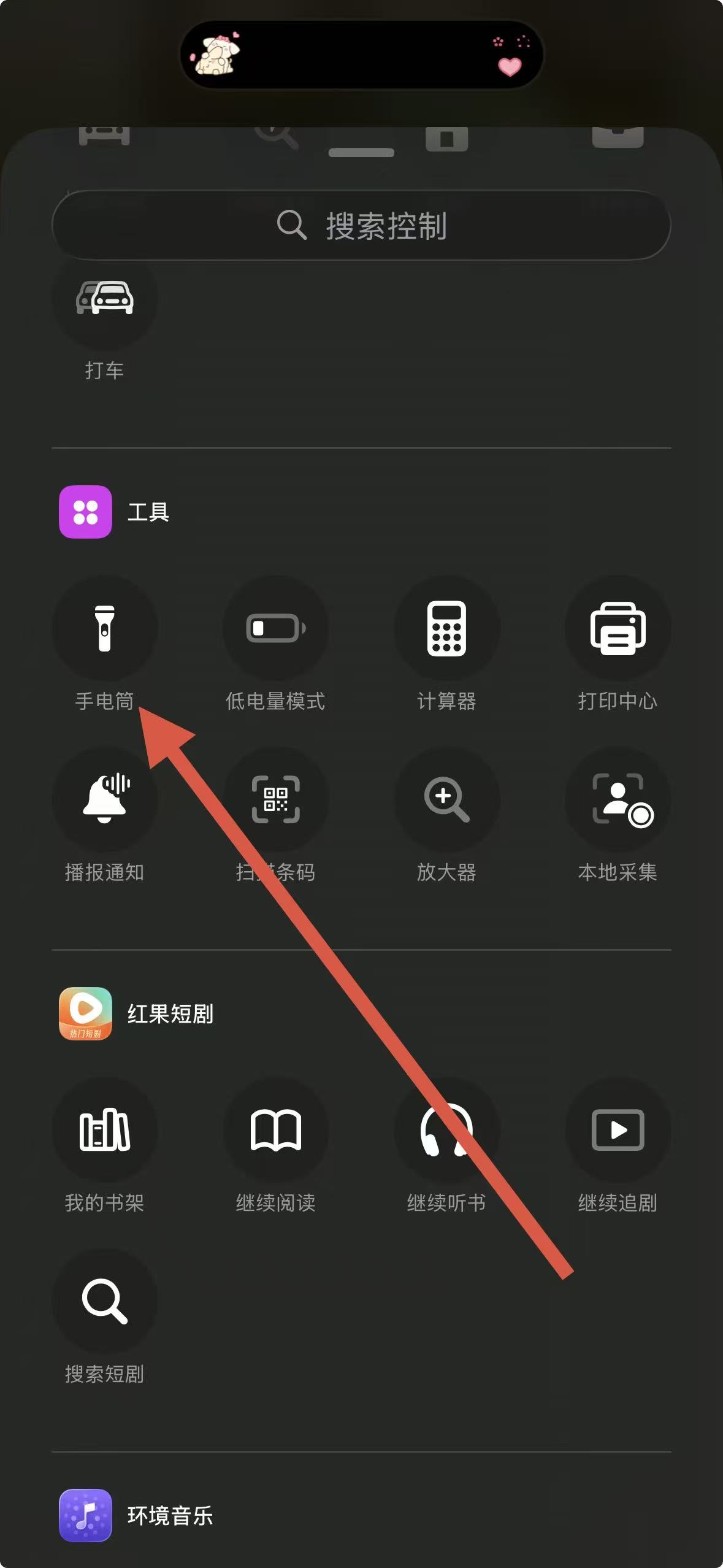 2、在添加控制界面的工具分類下,找到手電筒選項。