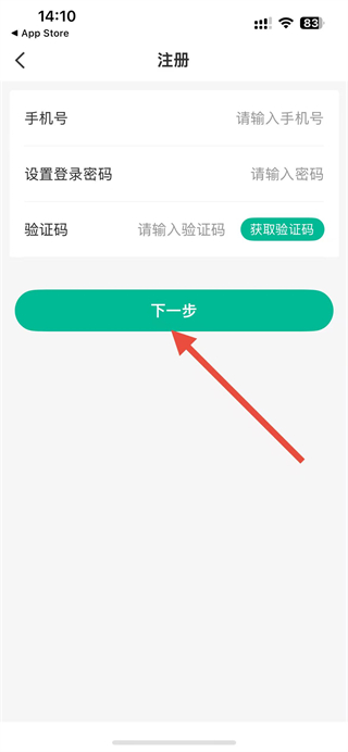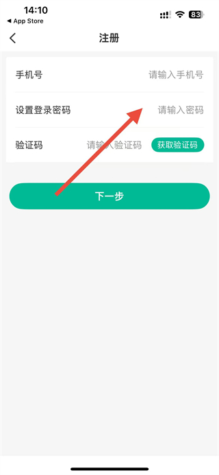 3、在注冊頁面,輸入手機號、設(shè)置登錄密碼,點擊獲取驗證碼并輸入驗證碼。
