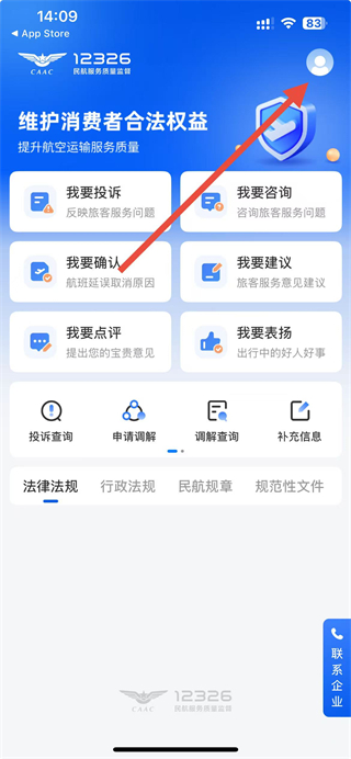 1、打開民航12326APP,點擊右上角個人中心圖標。