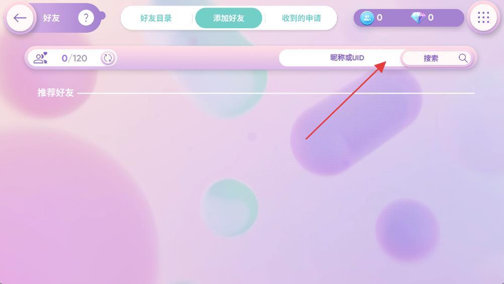 4、在搜索框中輸入對(duì)方的昵稱或UID,發(fā)送添加申請(qǐng)即可。