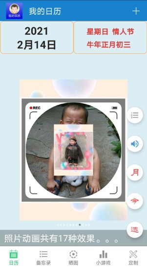 快速免費定制,用自己的照片,幾分鐘制作出屬于自己的相冊日歷。日歷頁面中間是動畫相冊,有17種動畫效果,每次打開APP都不同,還可以選擇背景音樂。曬圖頁面有許多動圖看,小游戲頁面有許多小游戲鏈接,定制頁面有許多免費圖書鏈接,都可以直接在應用內(nèi)打開。每天簽到可以領積分,積分可以用于應用內(nèi)支付。
