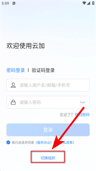1、打開云加APP登錄頁面,我們需要點(diǎn)擊切換組織的按鈕。