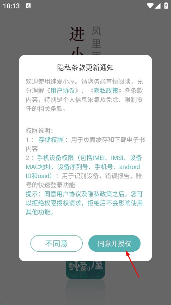 1、打開純愛小屋App,出現(xiàn)隱私條款更新通知彈窗,閱讀后點(diǎn)擊同意并授權(quán)按鈕。