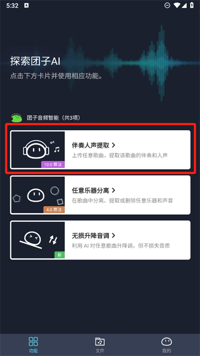 1、進(jìn)入軟件后可以看到有多個功能可以選擇,伴奏人聲提取功能支持上傳任意歌曲并提取該歌曲的伴奏和人聲;