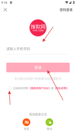 2、輸入手機(jī)號碼,并勾選已閱讀并同意搜款網(wǎng)用戶協(xié)議和隱私政策,點(diǎn)擊登錄。