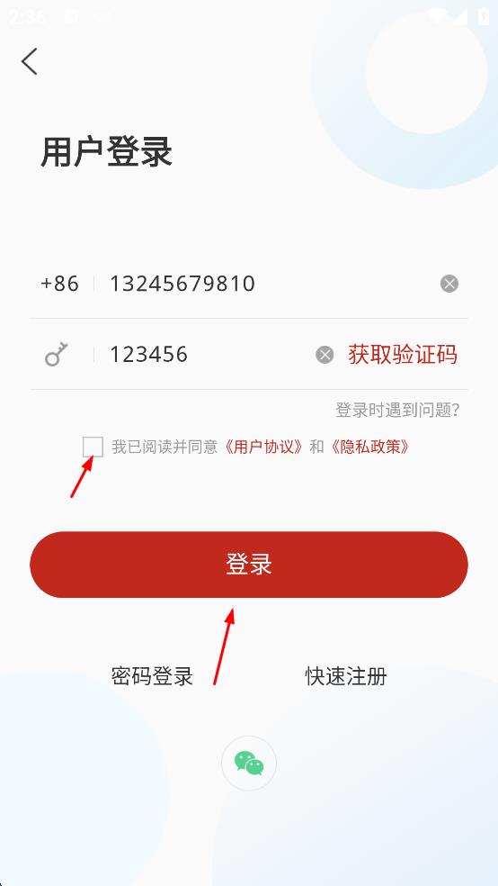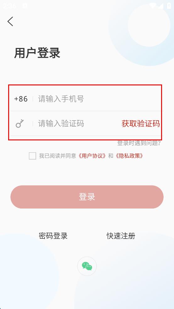 3、在用戶登錄頁面,首先在對應(yīng)的輸入框中輸入手機號碼,然后點擊獲取驗證碼,將收到的驗證碼輸入到驗證碼輸入框中。