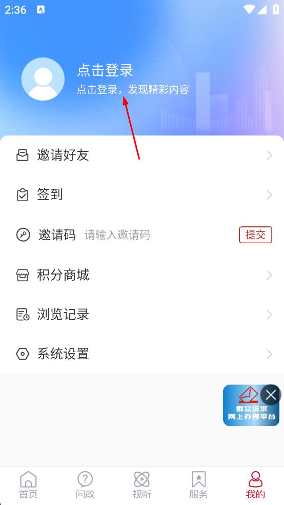 2、在個人中心頁面,能看到點擊登錄的提示,點擊該提示區(qū)域,進入到用戶登錄頁面。
