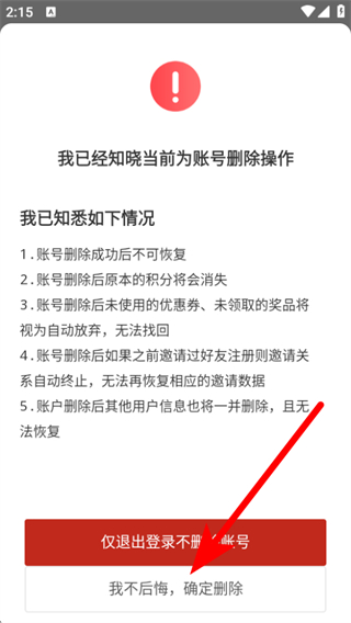 4、在注銷確認頁面,點擊我不后悔,確定刪除,完成賬號注銷操作。