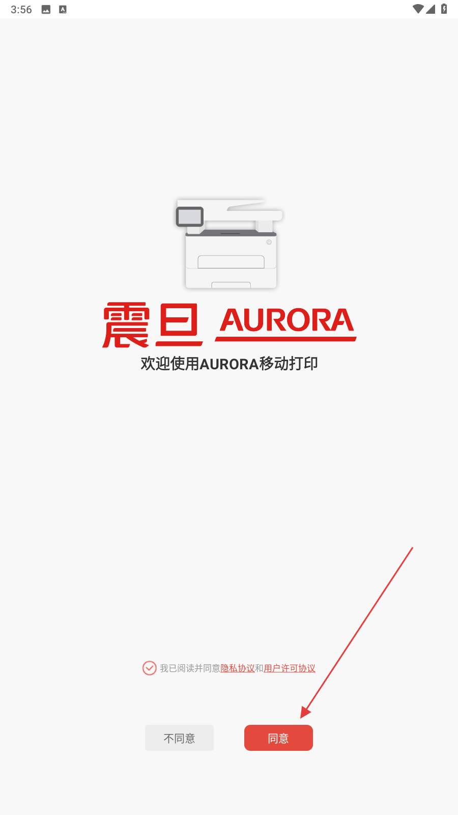 1、打開震旦打印機(jī)APP,進(jìn)入時勾選我已同意隱私政策后,再點擊同意的按鈕。