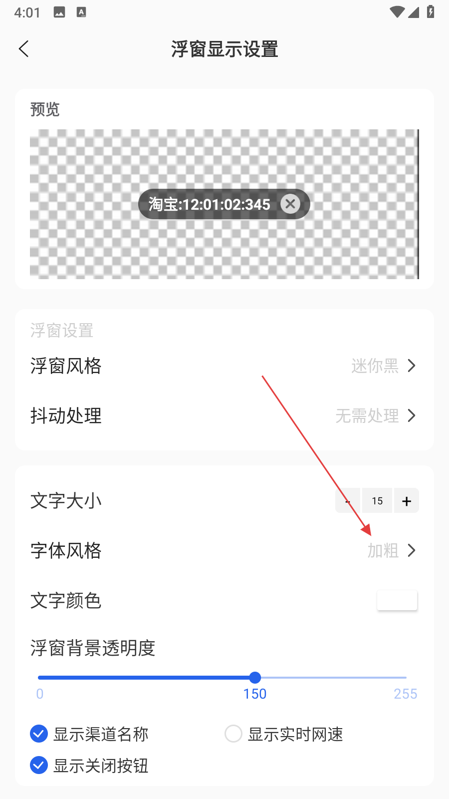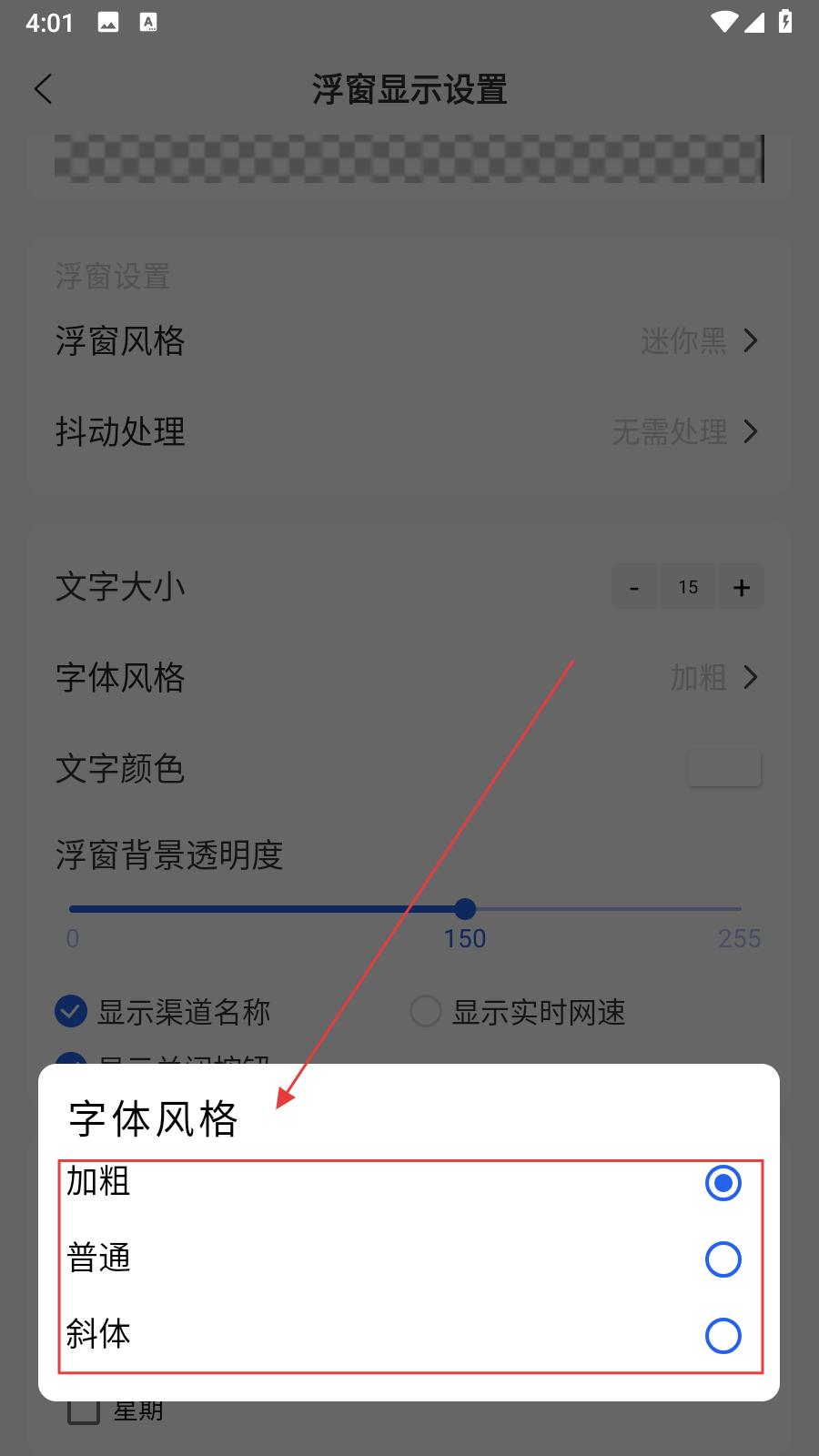 3、在浮窗顯示設(shè)置界面,點擊字體風格選項,彈出字體風格選擇窗口。