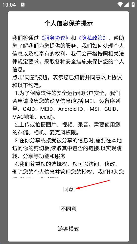 1、打開蒙漢翻譯通APP,在彈出的個人信息保護提示框中,點擊同意。
