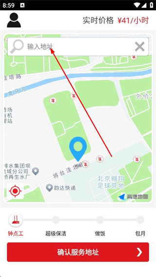 1、打開app,點擊頂部搜索框,輸入地址并完成定位。