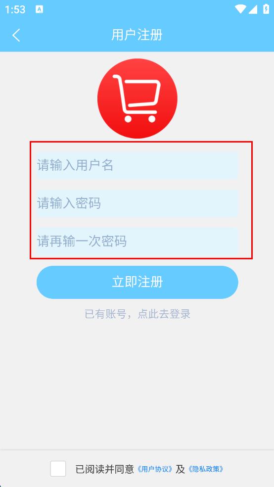 3、在用戶注冊(cè)頁(yè)面輸入用戶名、密碼并再次輸入密碼,勾選已閱讀并同意相關(guān)協(xié)議。