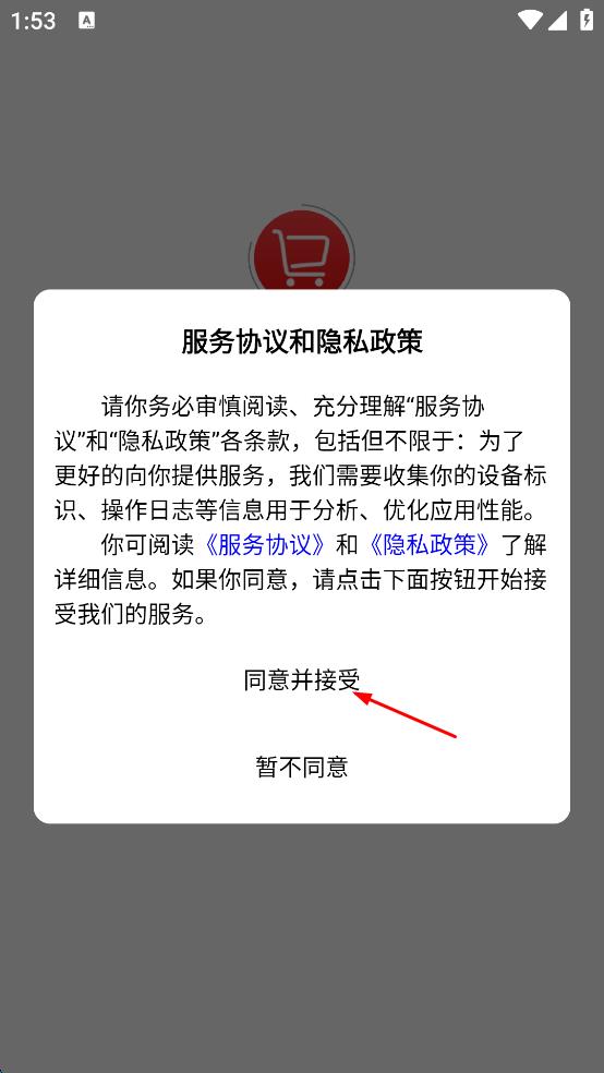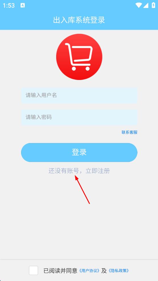 1、打開(kāi)出入庫(kù)系統(tǒng),彈出服務(wù)協(xié)議和隱私政策提示,點(diǎn)擊同意并接受,進(jìn)入出入庫(kù)系統(tǒng)登錄界面。