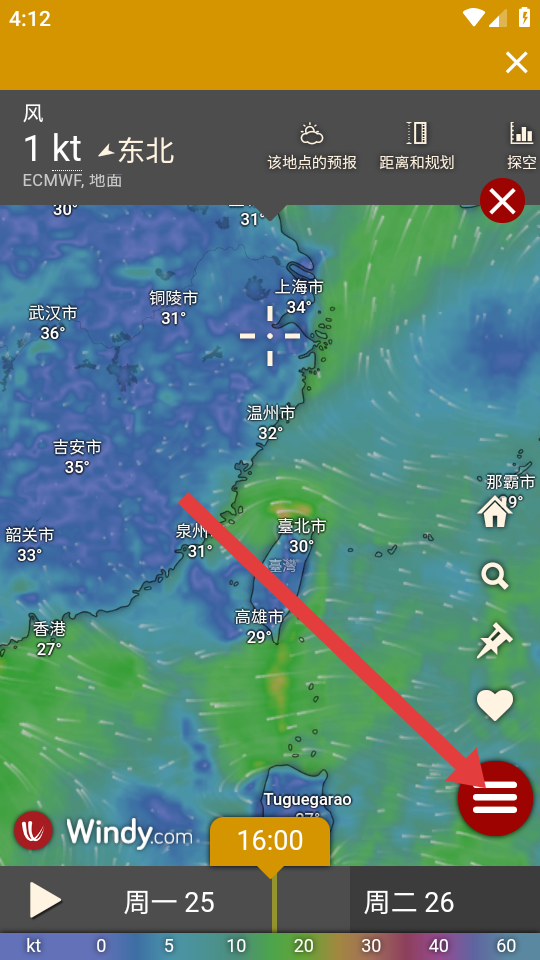1、打開Windy應(yīng)用,點擊界面右下角紅色三橫線的圖標,展開功能菜單,開啟風力信息查看的操作流程。