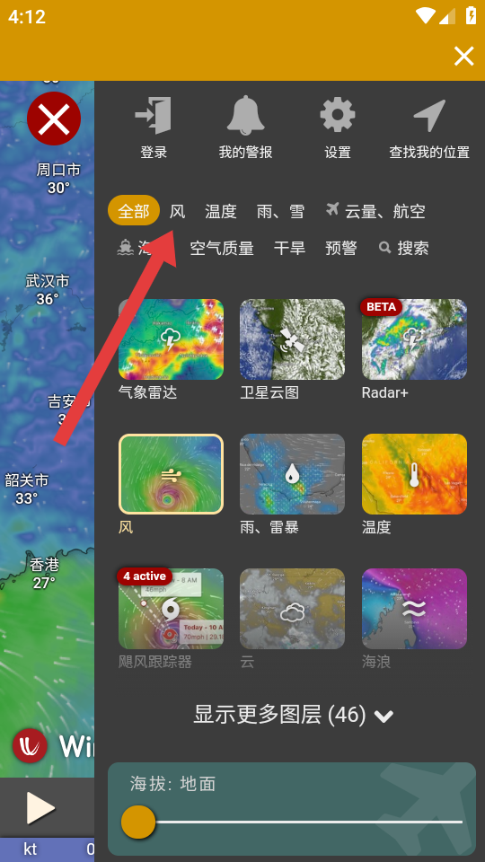 2、在展開的菜單中,選擇風的選項,位于全部標簽右側(cè),切換顯示風力相關(guān)的圖層數(shù)據(jù)。