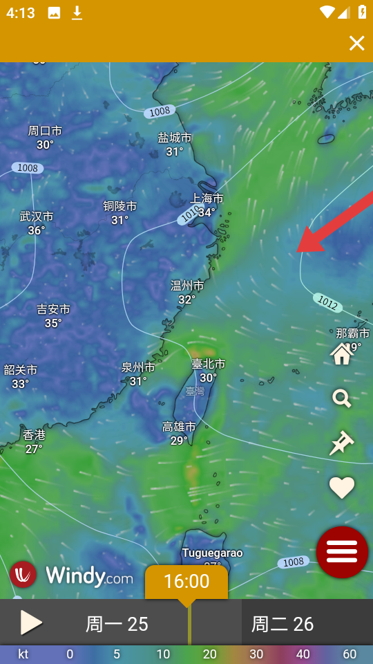 3、返回地圖界面,觀察風的流線分布與風速數(shù)值單位kt,結(jié)合蒲福風級表換算,即可獲知對應(yīng)風力等級。