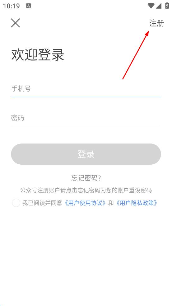 3、在登錄界面,點擊右上角的“注冊”選項,進(jìn)入手機號注冊頁面。