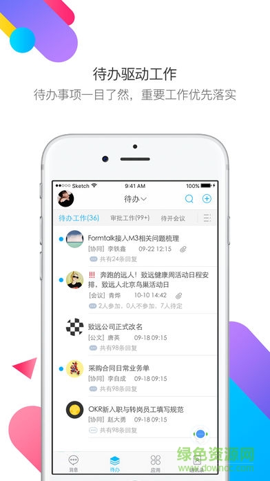 25類審批操作:加簽/會簽/指定回退/核定等;10類審批應用:用車審批、新聞審批、會議室審批等均可利用碎片化時間快速移動審批。