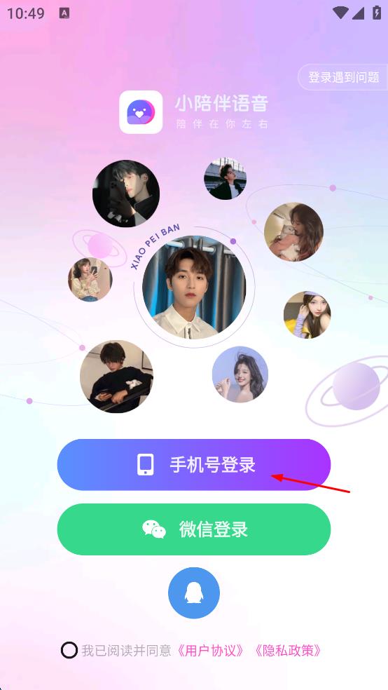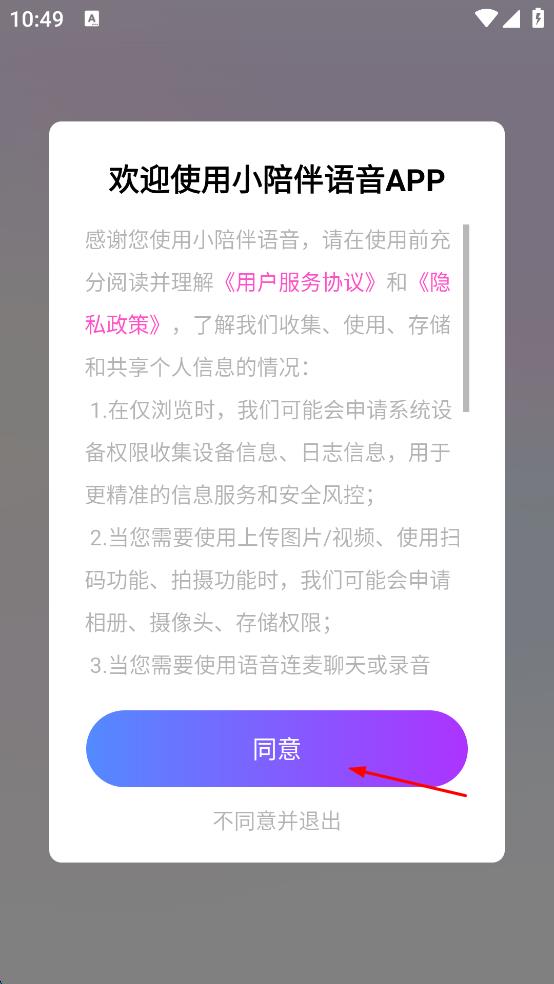 1、打開小陪伴語音,會出現(xiàn)用戶服務(wù)協(xié)議及隱私政策界面,仔細(xì)閱讀后點(diǎn)擊“同意”,進(jìn)入軟件登錄選擇頁面。