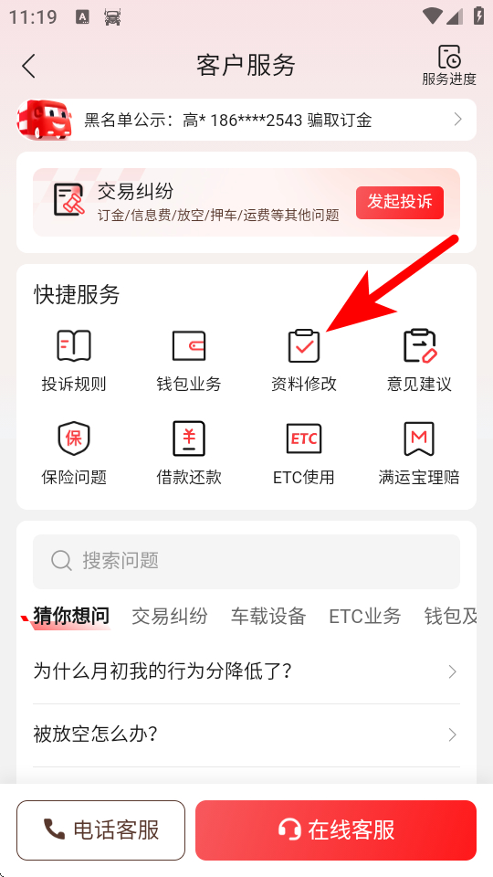 2、在客戶服務(wù)功能的頁面,點(diǎn)擊資料修改,進(jìn)入資料修改選項(xiàng)頁面。