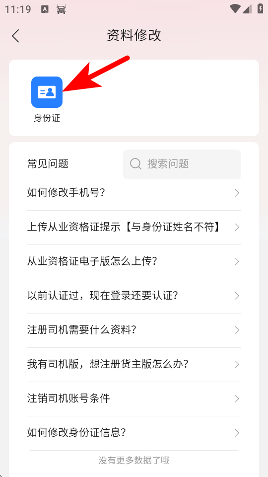 3、在資料修改選項(xiàng)頁面,點(diǎn)擊身份證,進(jìn)入司機(jī)實(shí)名認(rèn)證頁面。