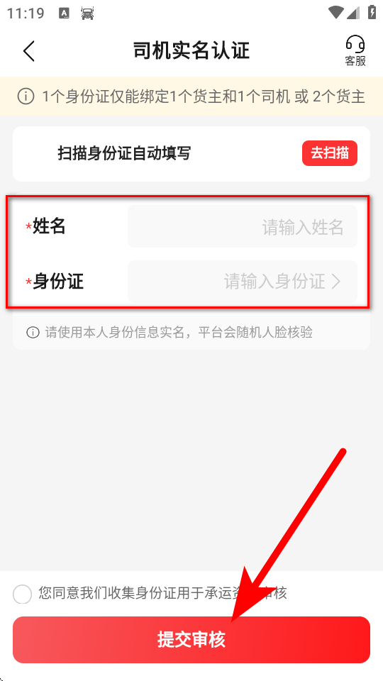 4、在頁面填寫信息并確認(rèn)協(xié)議后,點(diǎn)擊提交審核,完成司機(jī)認(rèn)證操作。