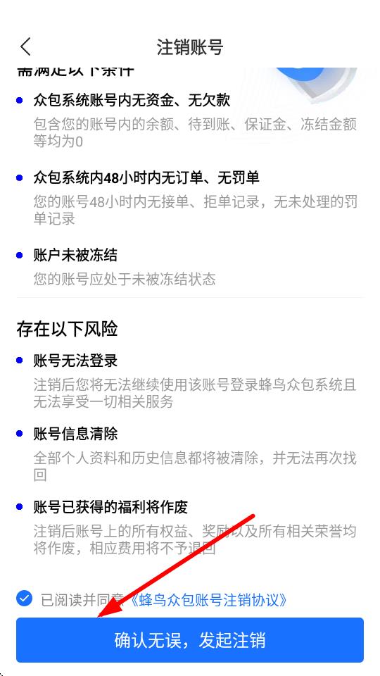 4、在頁面勾選注銷協議后點擊確認無誤,發(fā)起注銷,完成賬號注銷操作。