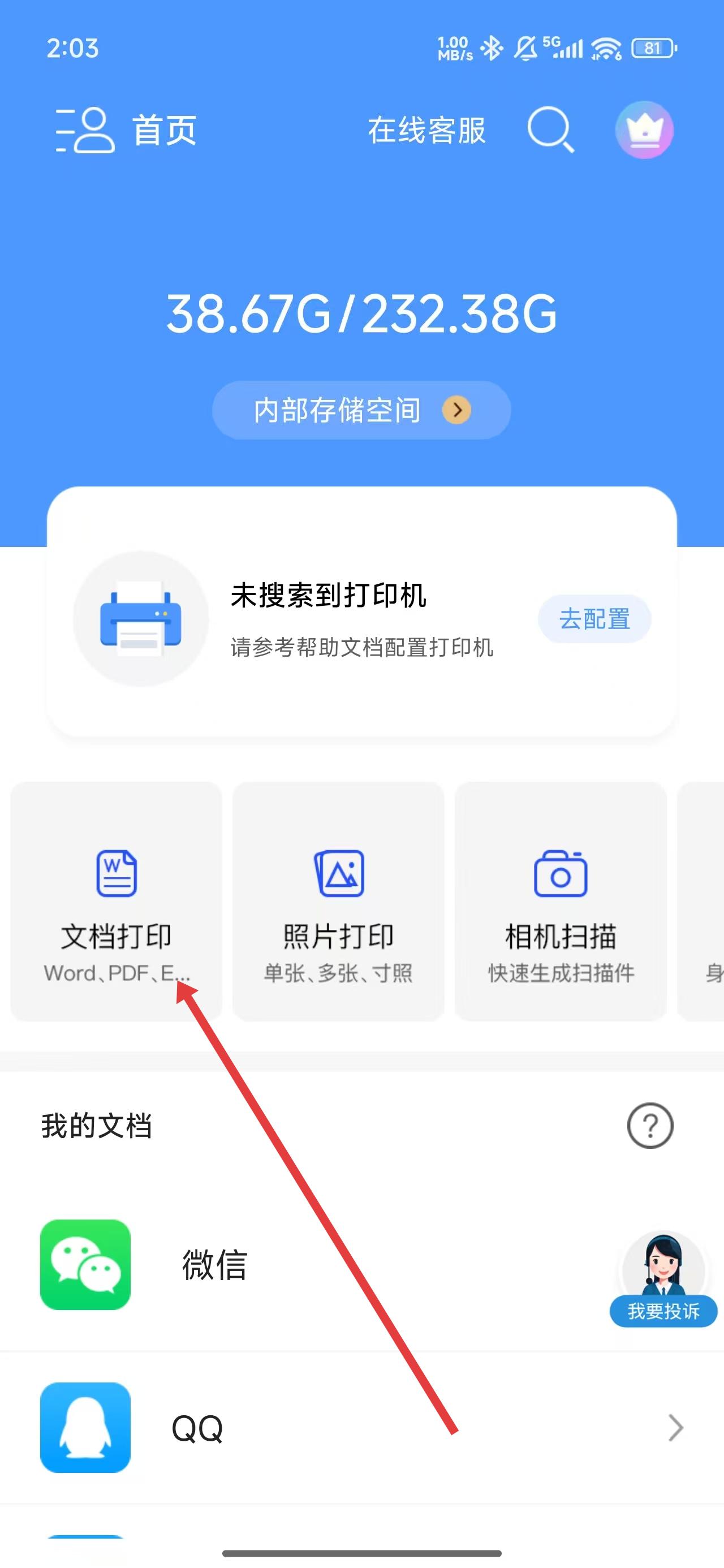 1、在進(jìn)入到應(yīng)用首頁中,可以點(diǎn)擊文檔打印選項(xiàng),準(zhǔn)備進(jìn)行打印文件操作。