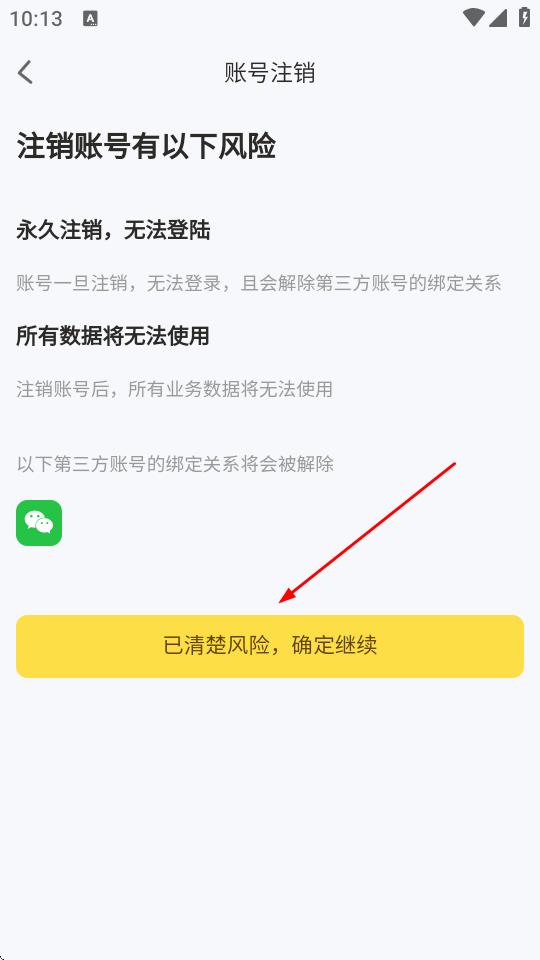 4、在賬號注銷提示頁面,閱讀注銷風險后,點擊已清楚風險,確定繼續(xù)。